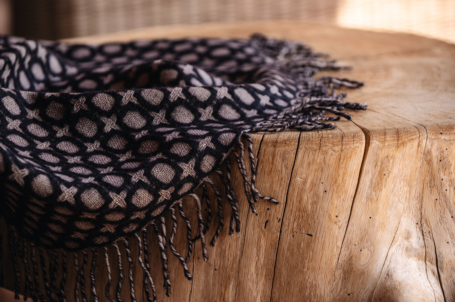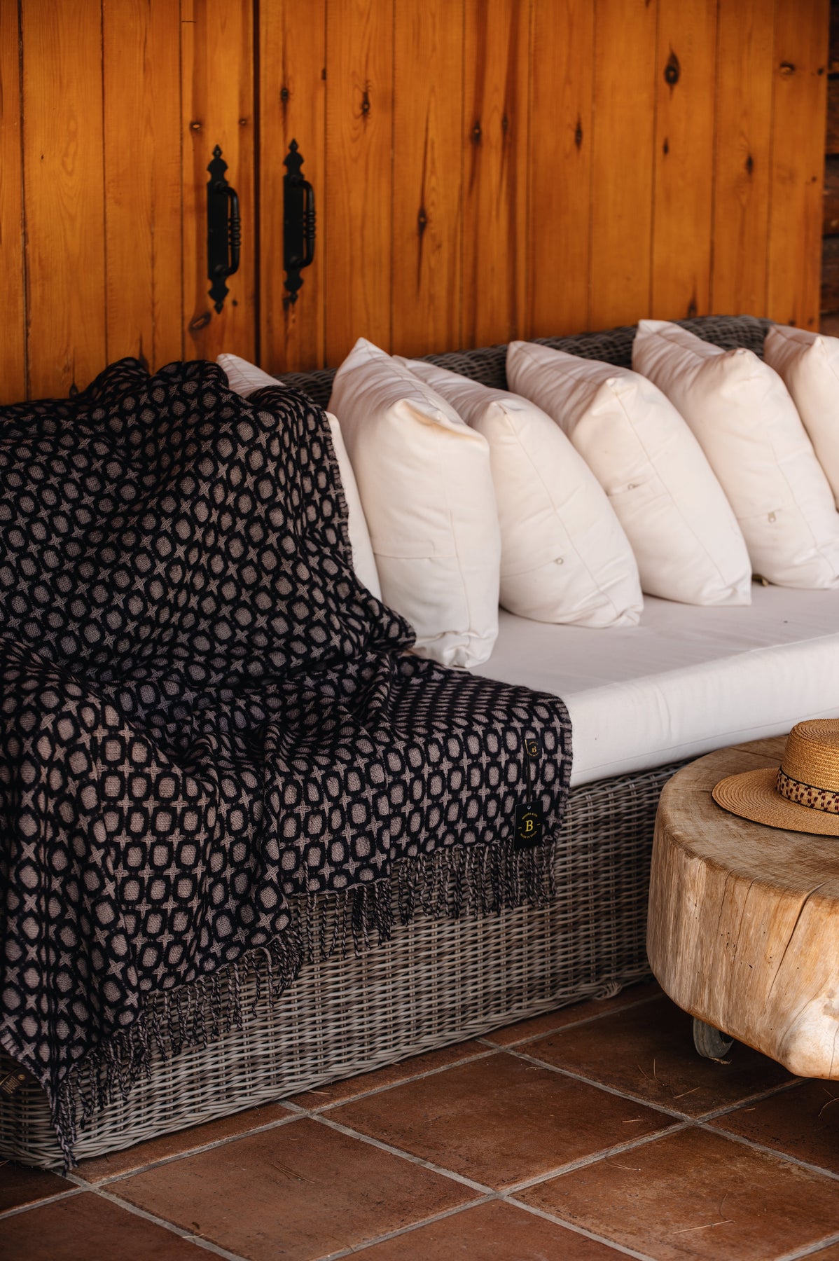 Picasso blanket in black color and with mohair circles in black color. The fringe is made of Wool. Handmade in Spain